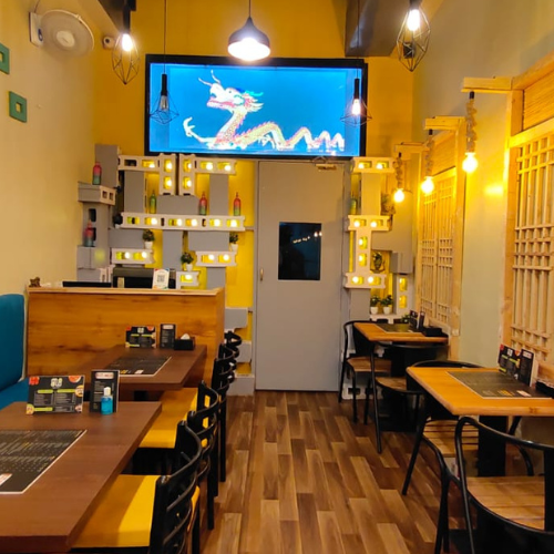 Hot Wok Café’s interior design in Kharghar captures the essence of casual dining with a vibrant, inviting ambiance.